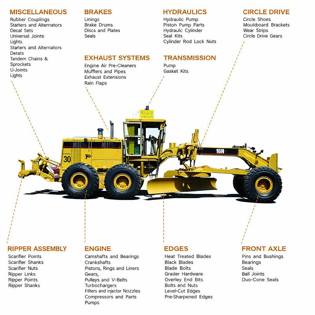 Parts compatible with leading motor grader brands like CAT, Komatsu, Volvo, SANY, XCMG, LiuGong, CASE & John Deere.